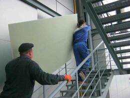 - Для выполнения погрузочно-разгрузочных работ могут быть задействованы грузчики, которые осуществят подъем на этаж при помощи лифта или по лестничным пролетам здания. Выгрузка крупной партии гипсокартона на паллетах возможна при помощи вилочного погрузчика, а также ручным способом с грузчиками.